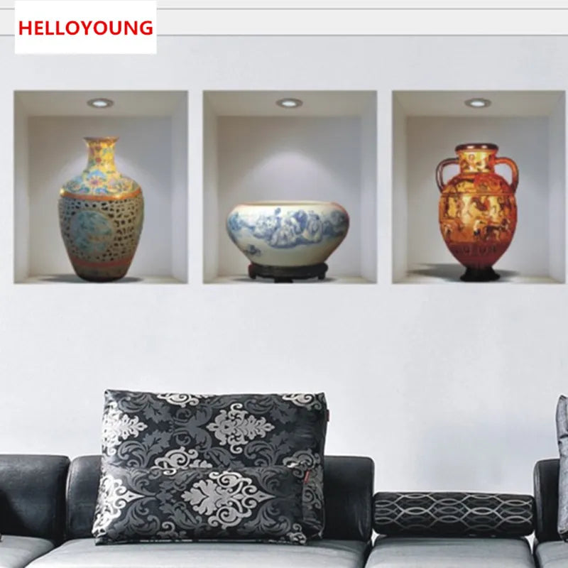 pack of 3 3D Simulation Ceramic Vase Wall Stickers Living Room Bedroom Decoration Sticker PVC Material Self-adhesive Environmental Protection Removable Decor Wallpaper