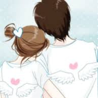 The image shows a Korean-style cartoon (aeni) of a couple with angel wings on their backs. The text translates to " in Korean. It is likely intended as a romantic or affectionate image, possibly for use as wallpaper