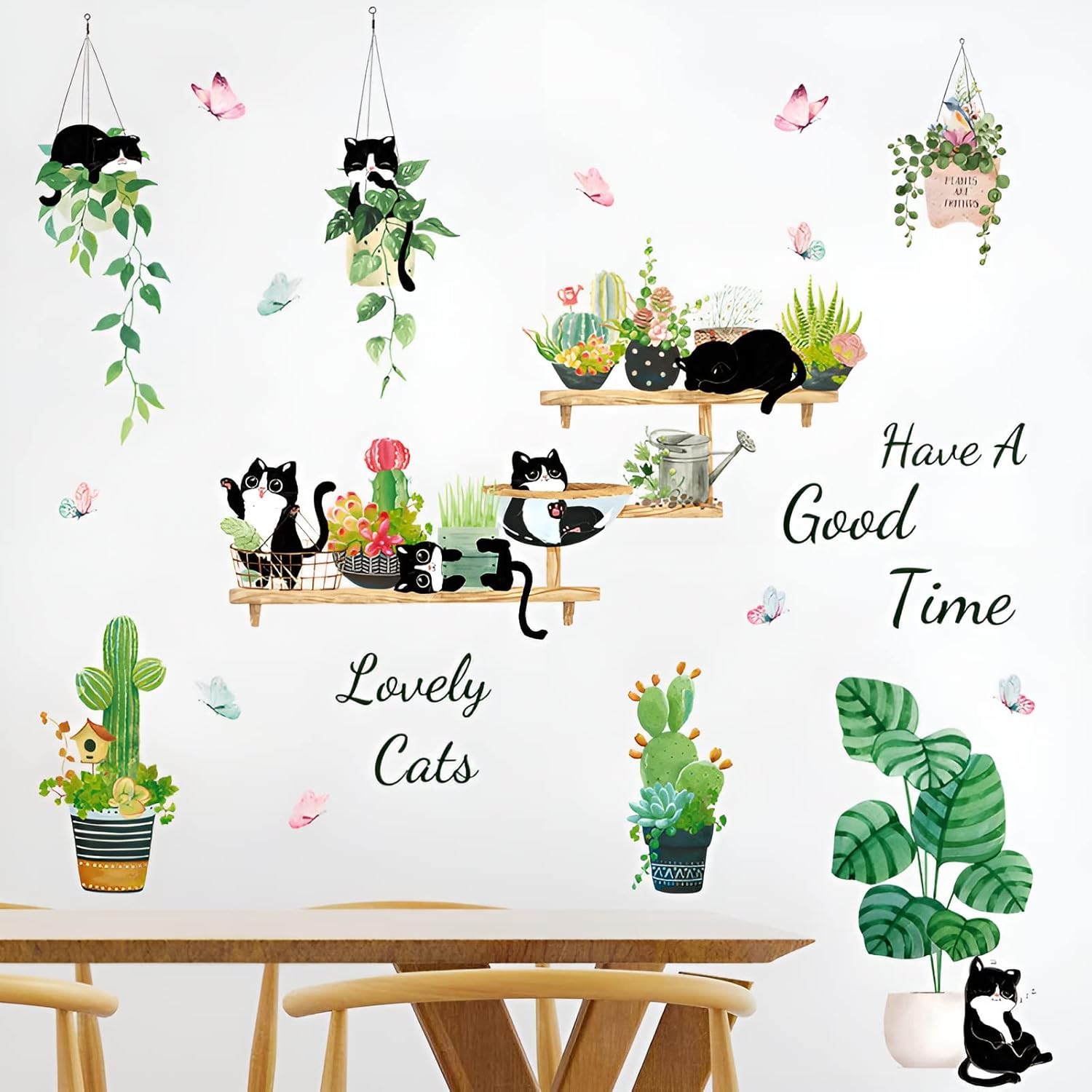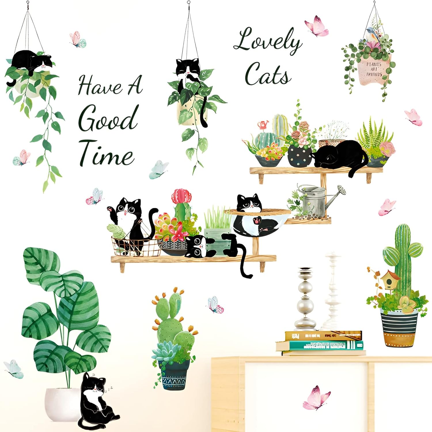 High Quality Wall StickersDecorative wall stickers are of high quality, easy to apply and peel off, adhere firmly to smooth, clean and dry surfaces, easily removed without damaging the wall Package content2 pieces of 30cm x 90cm, large-leaved green plants, small succulents, 7 playful cartoon cats and colorful butterflies playing and playing, the picture is full of childish interest Parent-child interactionCute cartoon cat decorative wall stickers, also suitable as parent-child interaction gifts, you can DIY with children, stimulate children's imagination in the entertainment process and cultivate their creativity and hands-on ability Affordable Decor StylesBeautifully shaped tropical plant wall decals add color and vibrancy to your room at the most affordable price. affordable its ns the hassle of painting and cleaning! Best Gift IdeasThe wall decal is the perfect gift for a baby shower, delivery, baby shower or christening. Also great for decorating bathrooms, glass windows, kitchens, closets, classrooms, girls bedrooms, Christmas or birthday parties