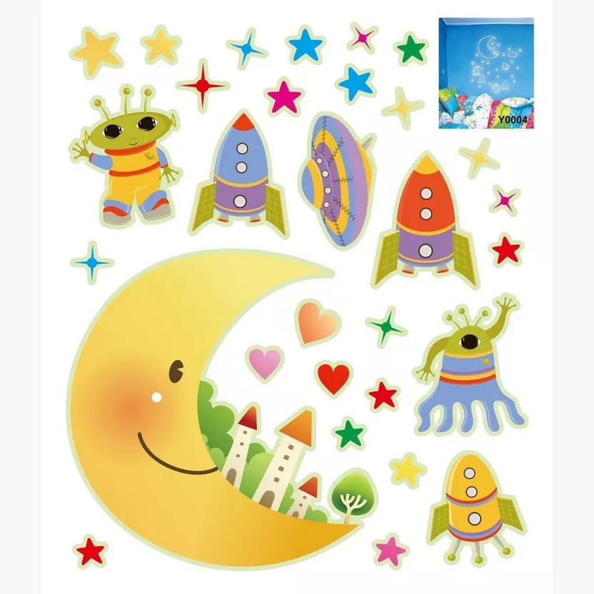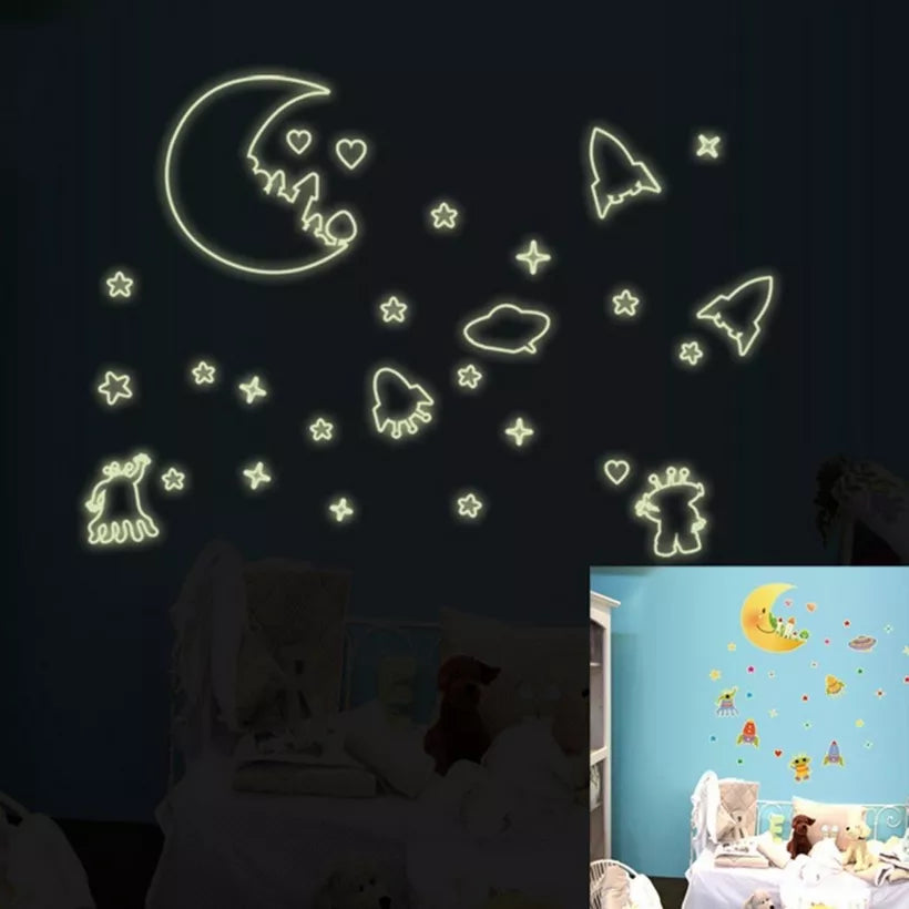 Made from quality material and showcasing a theme that involves the space and moon, these stickers will glow in the dark and provide a beautiful touch to the bedroom decor of your champ's room. Easy to stick onto the wall of your choice and reuse as per need, you can wipe clean this set of stickers for upkeep.