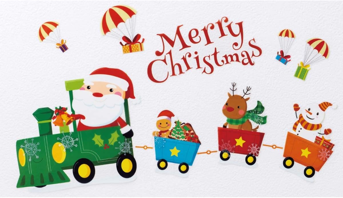 Snowman and reindeer on a colorful train with Santa front window seal Not only can you decorate walls but also show cases, windows and mirrors for Christmas store displays. You can even apply it to infection-resistant vinyl sheets or acrylic boards.