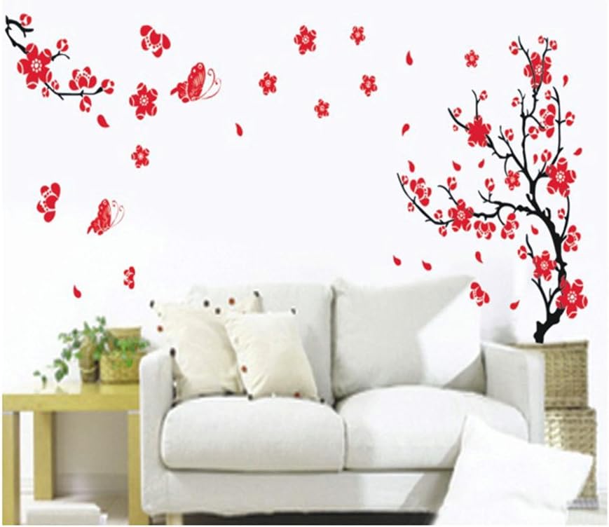 VAGA Stylish Adhesive Rooms Walls Vinyl DIY Stickers/Murals/Decals/Tattoos/Transfers with Red Japanese Cherry Blossoms Tree/Branch and Butterflies Designs